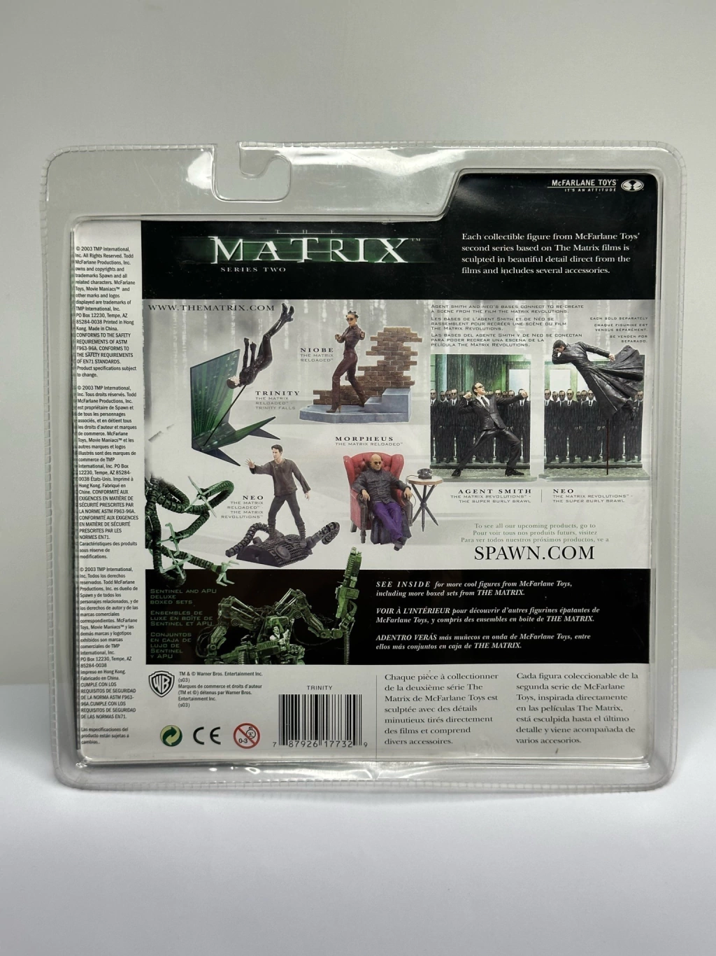 Lanzada en 2003 como parte de la Series Two de McFarlane Toys, esta figura de Trinity, la heroína de The Matrix, captura a la perfección su estilo letal y elegante.