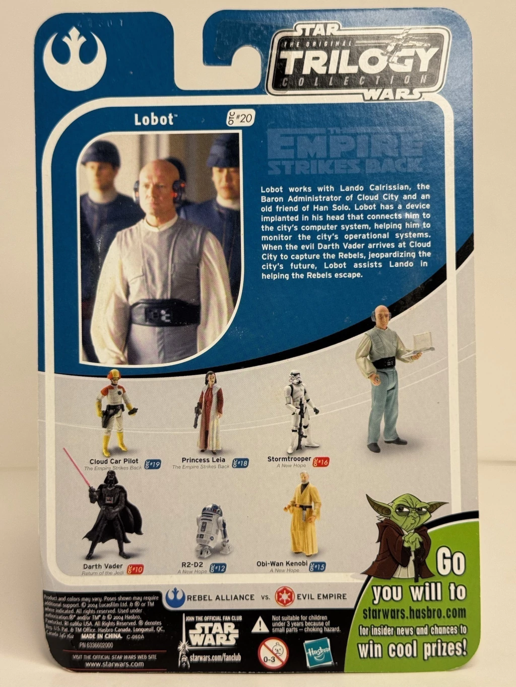 Figura de Lobot, parte de la línea The Original Trilogy Collection de Hasbro (2004). Representa al asistente ciborg de Lando Calrissian en Star Wars: Episodio V – El Imperio Contraataca, con un diseño fiel a su icónica apariencia en la saga.