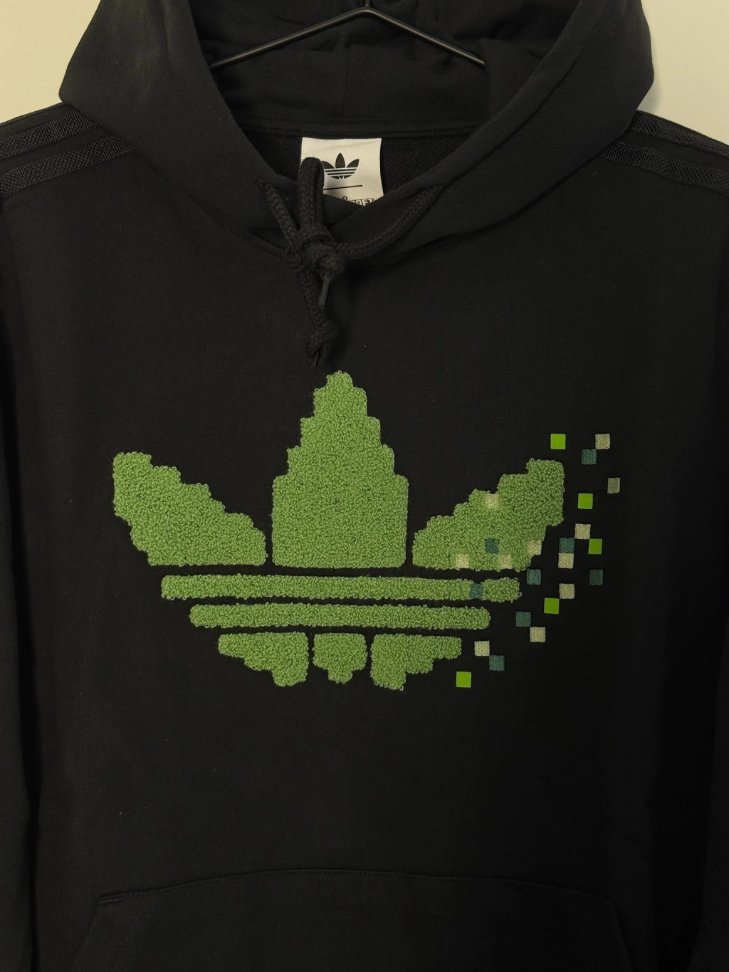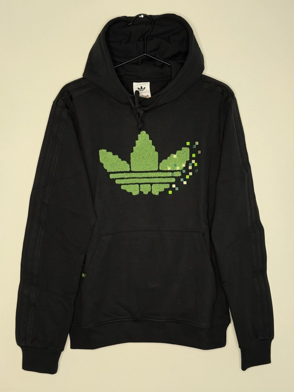 El Adidas Originals x Minecraft Hoodie Estampado es una prenda destacada de la colaboración lanzada en abril de 2025 entre Adidas Originals y Minecraft, inspirada en A Minecraft Movie. Este buzo con capucha traslada el universo pixelado del videojuego al streetwear, con un estampado vibrante en la espalda que recrea escenas icónicas del juego, como portales o paisajes del Overworld, usando técnicas gráficas mixtas. Confeccionado en algodón suave, ofrece un ajuste cómodo y relajado, con detalles acanalados y un logo Trefoil pixelado en el pecho. Disponible en colores como negro y blanco, es ideal para jóvenes fans del gaming y la moda urbana.