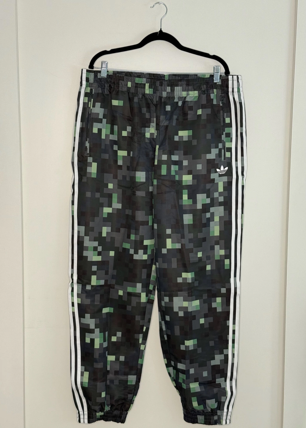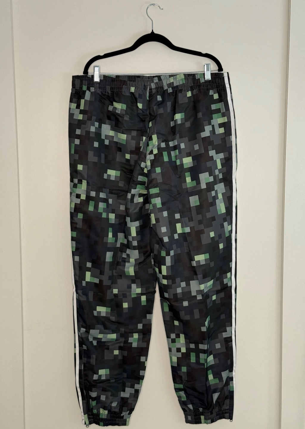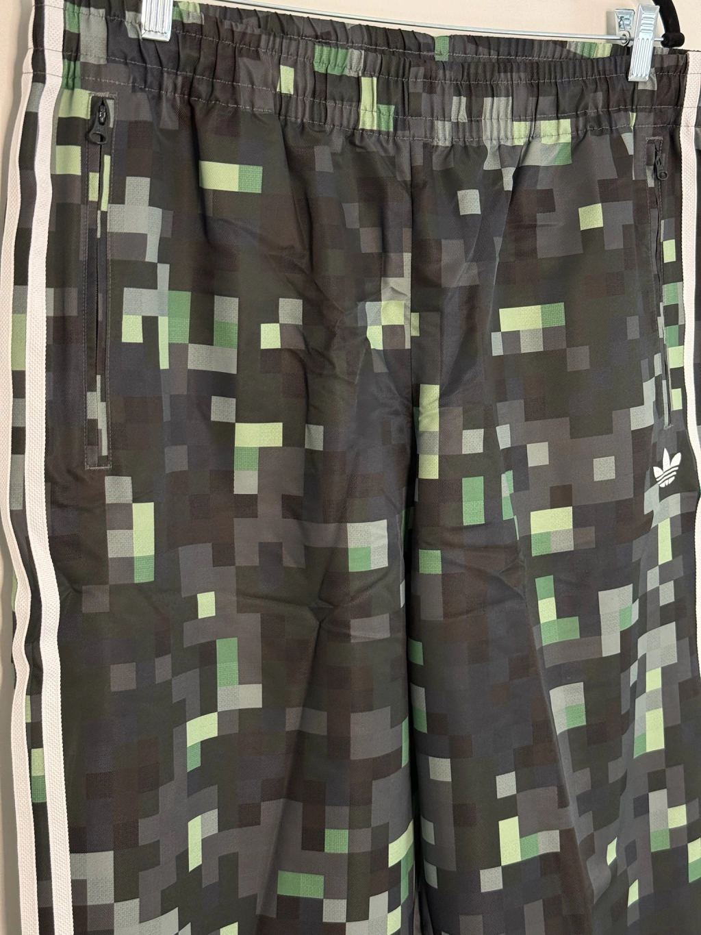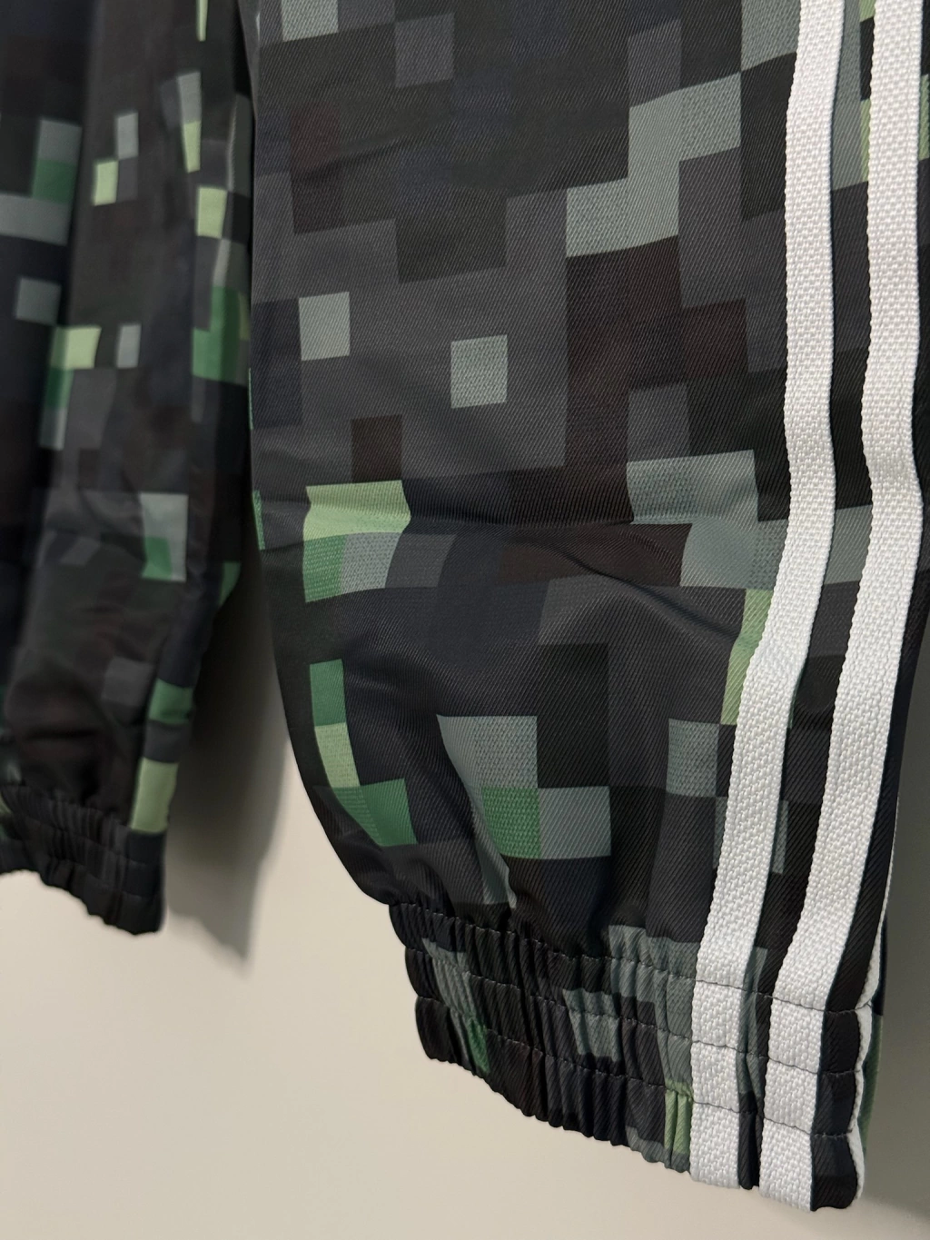 El Adidas Originals x Minecraft Trackpant Camo es parte de la colaboración lanzada en 2025 entre Adidas y Minecraft, inspirada en A Minecraft Movie y el universo pixelado del videojuego. Estos pantalones deportivos combinan el estilo icónico de Adidas con un diseño que evoca los paisajes y mobs del juego. Presentan un estampado de camuflaje pixelado en tonos verdes o azules (según variante), con un degradado que refleja el mundo del Overworld o el inframundo. Confeccionados en poliéster reciclado y sarga tejida, ofrecen un ajuste holgado, tres rayas laterales y un logo Trefoil pixelado. Ideales para fans de Minecraft y streetwear, son perfectos para un look casual y gamer.